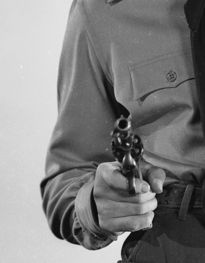 The gun in question was a revolver, and when a person or camera is looking down the business end of a loaded revolver, the bullets in the cylinder are visible. To look at a gun pointed at the viewer and produce this view safely, inert cartridges without primers or powder are used. The suit says, “No live ammunition was to be used during the filming of this movie.” When fired for effect on film, the guns were to use blanks, or cartridges that did not contain any bullet projectile.