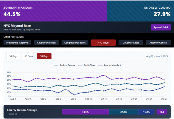 Voters in New York City are preparing for what looks to be a seismic change in local governance with Democratic Party candidate Zohran Mamdani going into the final stretch a whopping 16.6% ahead of now-independent candidate Andrew Cuomo (44.5% versus 27.9%). As Liberty Nation News’ Public Square polling tool shows, the averages have not really changed since the race began.
